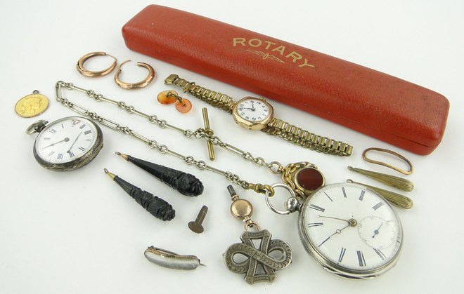 Box containing 2 silver keywind pocket watches, gold swivel fob, gold watch key, French gold 20Franc coin, etc.