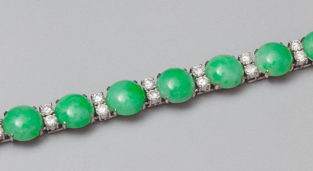 Bracelet, 925 MM, adorned with eight jadeite jade cabochons interspersed nine bars of two brilliant