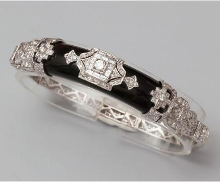 Bracelet in white gold, onyx applied a centered three grounds covered with brilliant cut diamonds