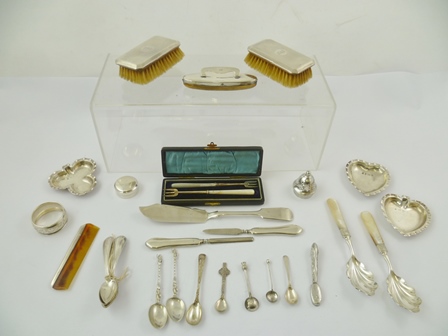 BREWIS & CO. (WILLIAM HENRY BREWIS) A LATE VICTORIAN SILVER BUTTER KNIFE with fiddle pattern handle, London 1890, together with MISCELLANEOUS SILVER ITEMS to include a pair of silver mounted brushes, three (from a set of four) card suit ashtrays, two