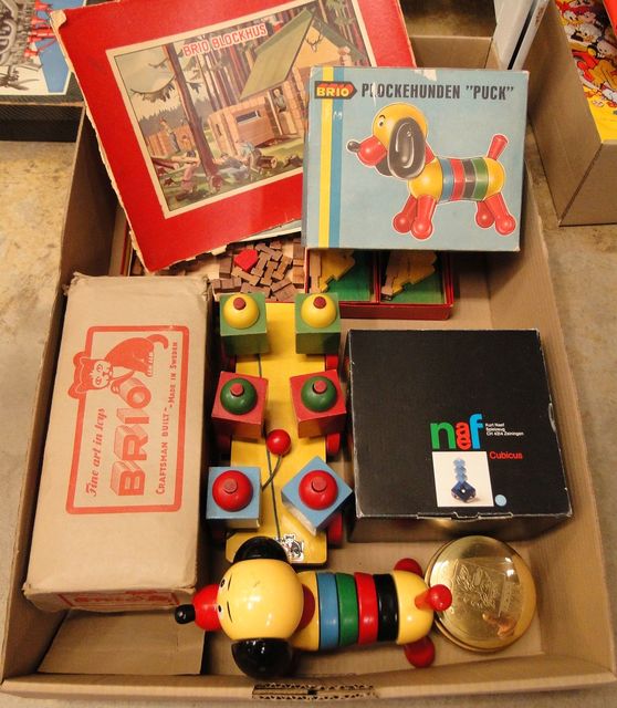 Brio leksaker i original kartonger, blockhus ej komplett, dragvagn samt Plockehunden Puck, kartong slitage, spel