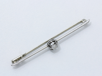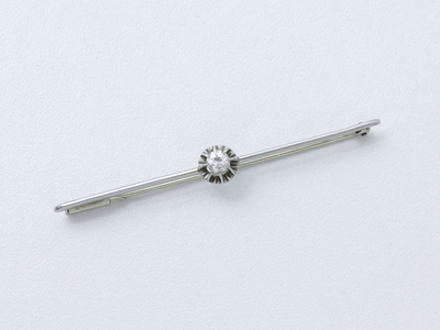 Broche barrette en or 750 et platine 850 millièmes ornée d'un diamant demi-taille en serti griffe. Travail français vers 1930. Poids du diamant: 0.20 ct env. Poids brut: 3.30 g. Long: 5.7 cm.