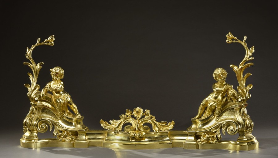 In front of chimney in red bronze decorated with Puttis on open and foliated consoles connected by a bar of fire leaf.