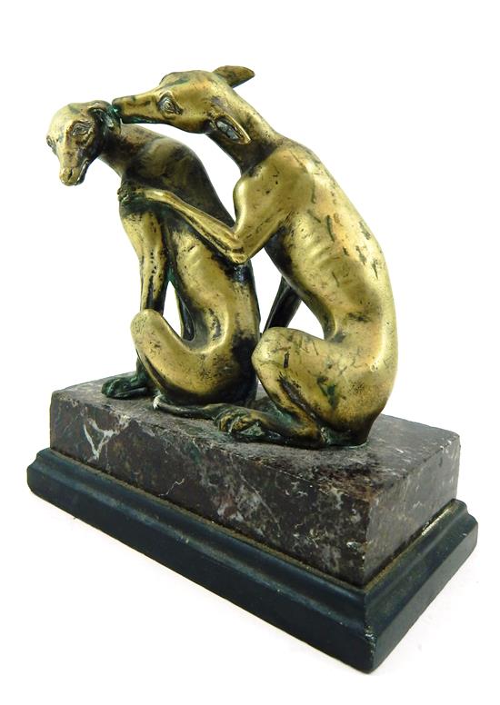 bronze greyhound dog grouping on beveled red marble and slate base