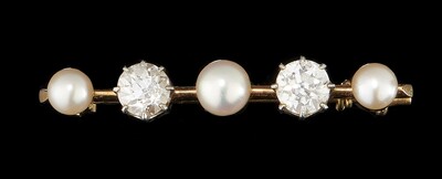 Brooch barrette set with three alternate pearls of two old cut diamonds (about 1.4 ct)