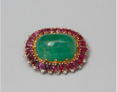 Brooch in yellow gold, 750 MM, adorned with a large emerald cabochon ruby in a row of carved foliage