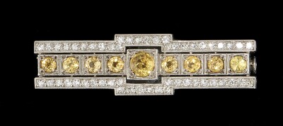 Brooch set with a line of falling yellow sapphires (about 0.5 ct) surrounded on both sides of a line of diamonds