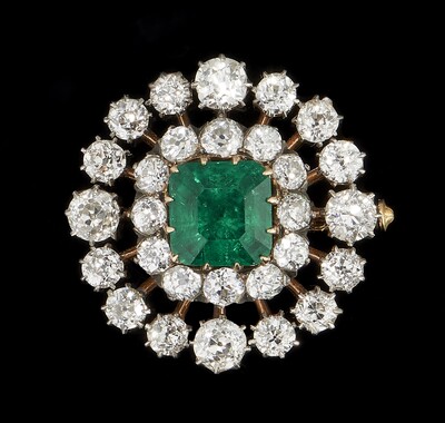 Brooch set with a square emerald (about 3.5 ct) in a double entourage of old cut diamonds (about 4.5 ct)