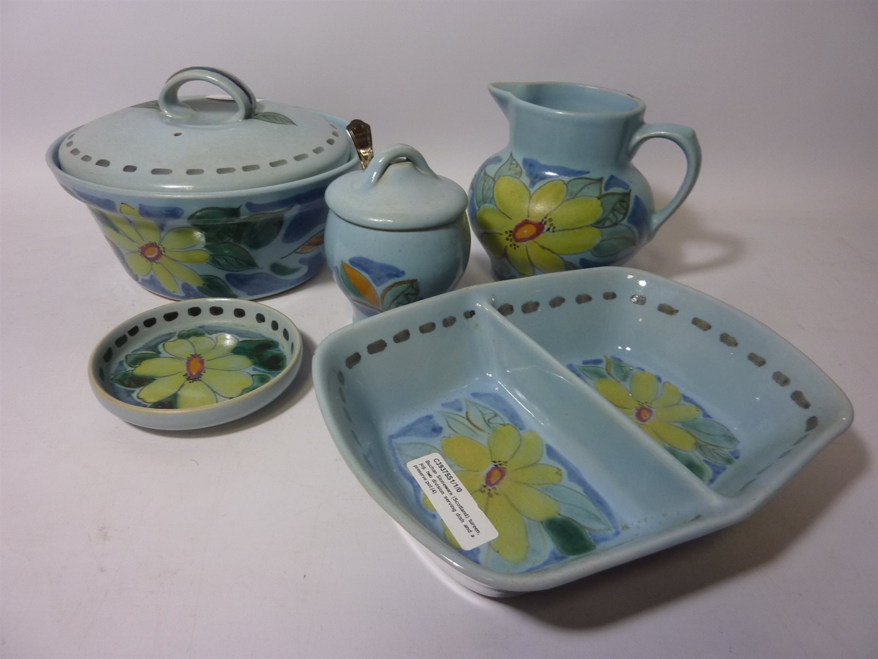 Buchan Stoneware (Scotland) tureen, jug, two division serving dish, preserve pot and coaster (5)