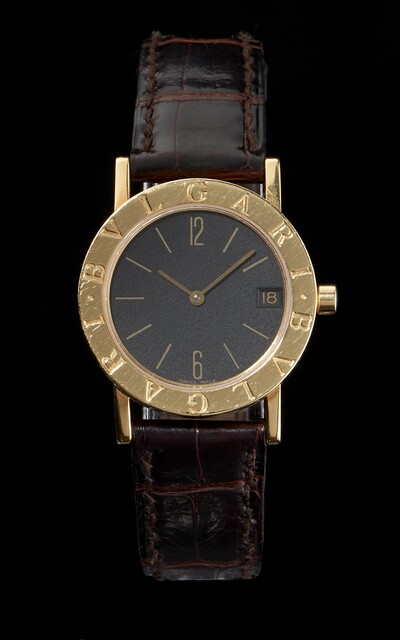 Black dial, golden hour markers and indexes, date window at 3 o'clock, 750 gold, D 30 mm, gross weight 39 g