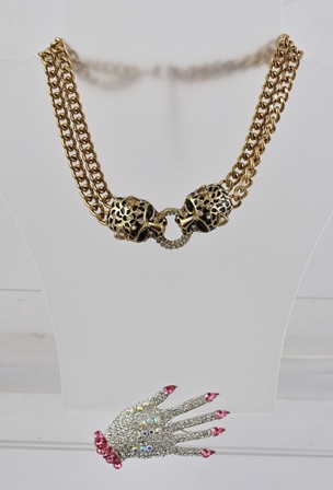 BUTLER & WILSON A DIAMANTE HAND BROOCH and a double PANTHER HEAD NECKLET, on hammered curb chain