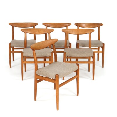 Set of six dining chairs with frame of oak. Seat upholstered with grey wool