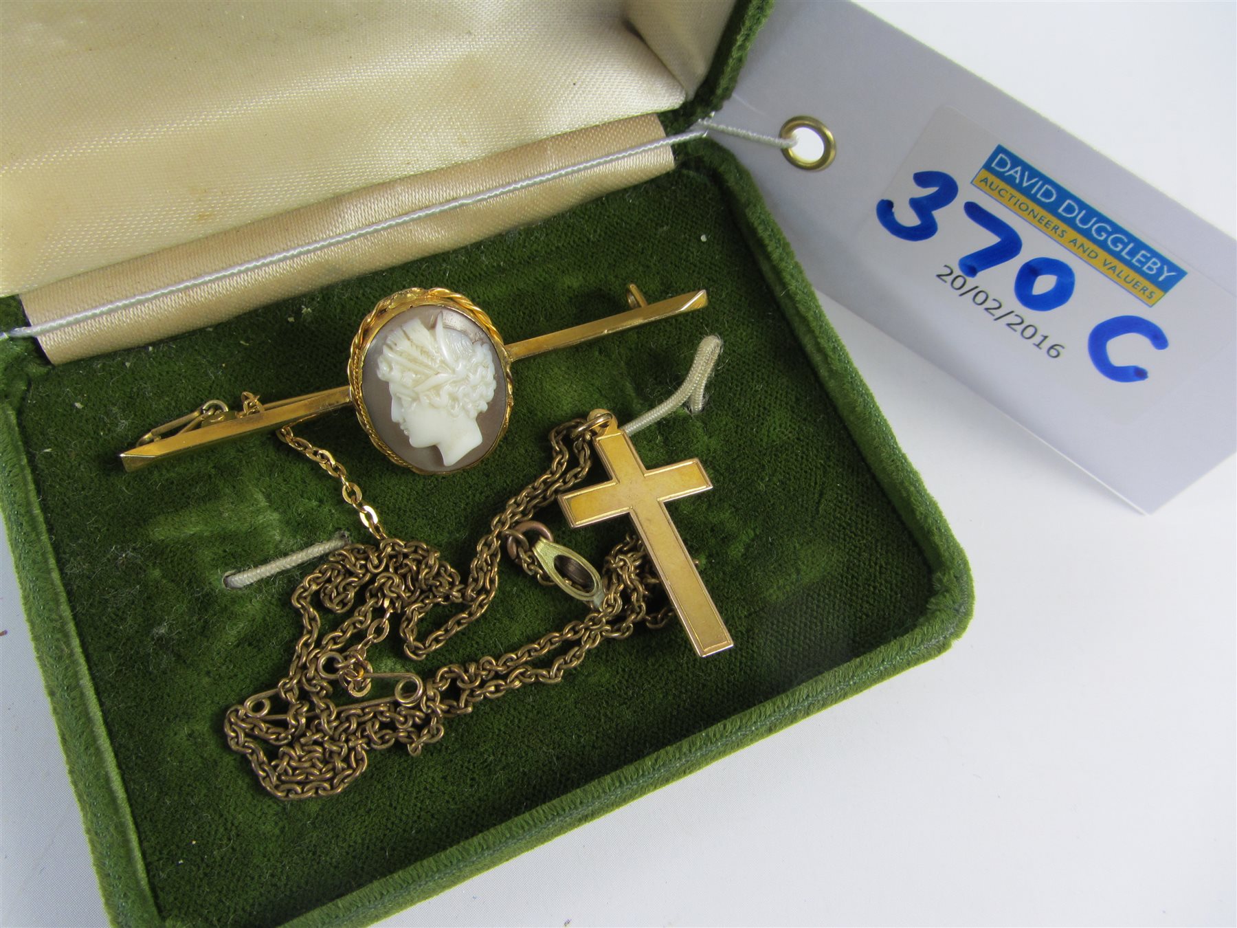 Cameo bar brooch stamped 9ct and a cross pendant stamped 9ct