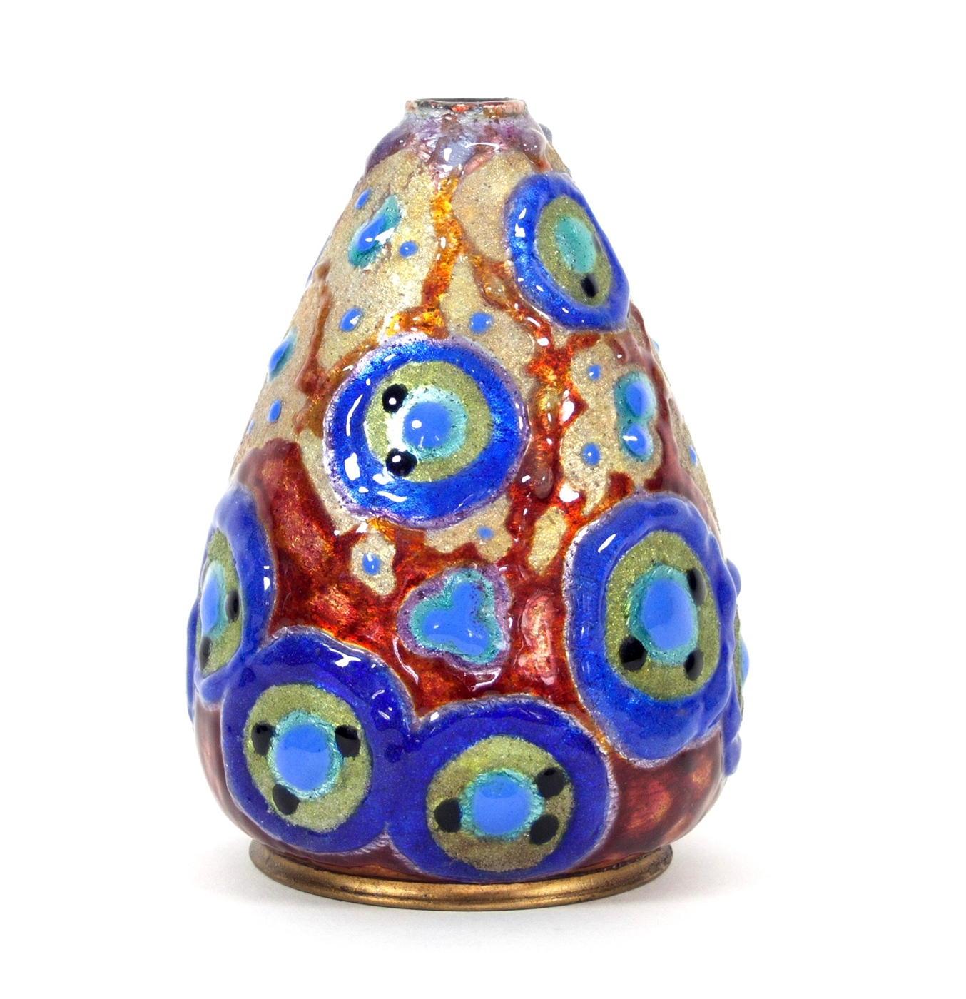 of tapered baluster form, decorated with stylised roundels on an orange and cream ground, signed C. FAURÉ, Limoges