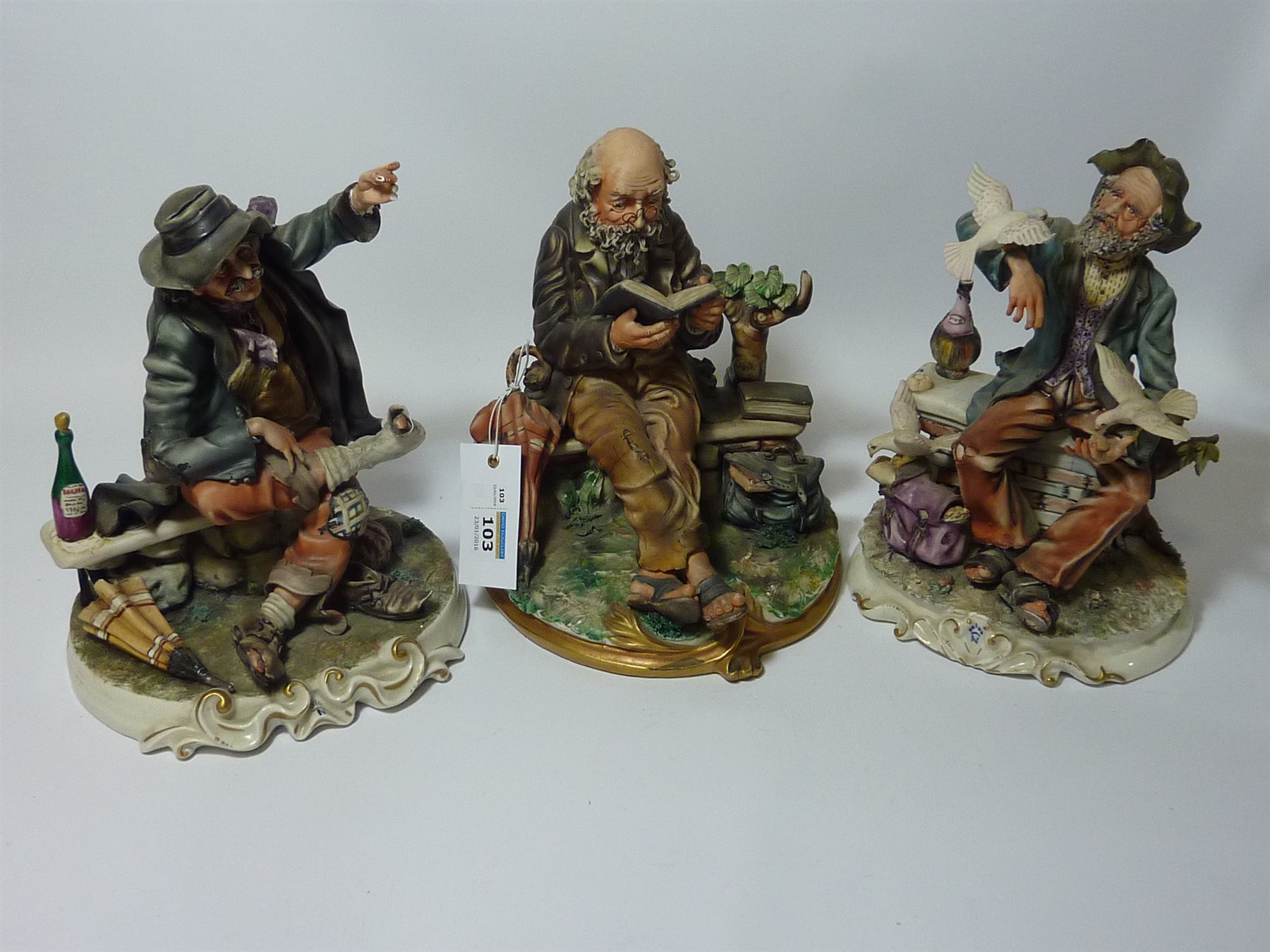Capodimonte figure of a man reading on a bench and two Capodimonte tramp figures (3)