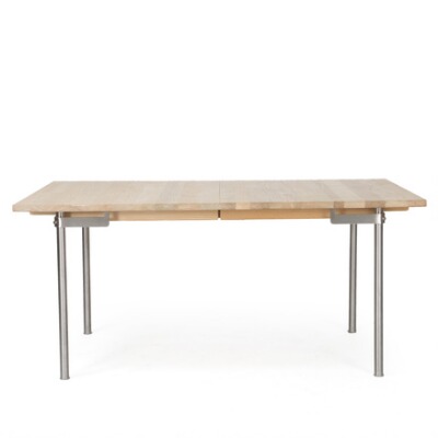 Dining table with extension, legs of steel and top of solid ash