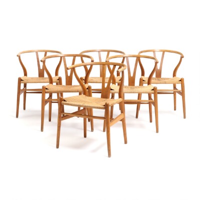 “Y-chair/The Wishbone Chair”. A set of six patinated beech armchairs with woven papercord in seats. Model CH 24. Designed 1949. Manufactured by Carl Hansen & Søn, Odense. 1950's. (6)