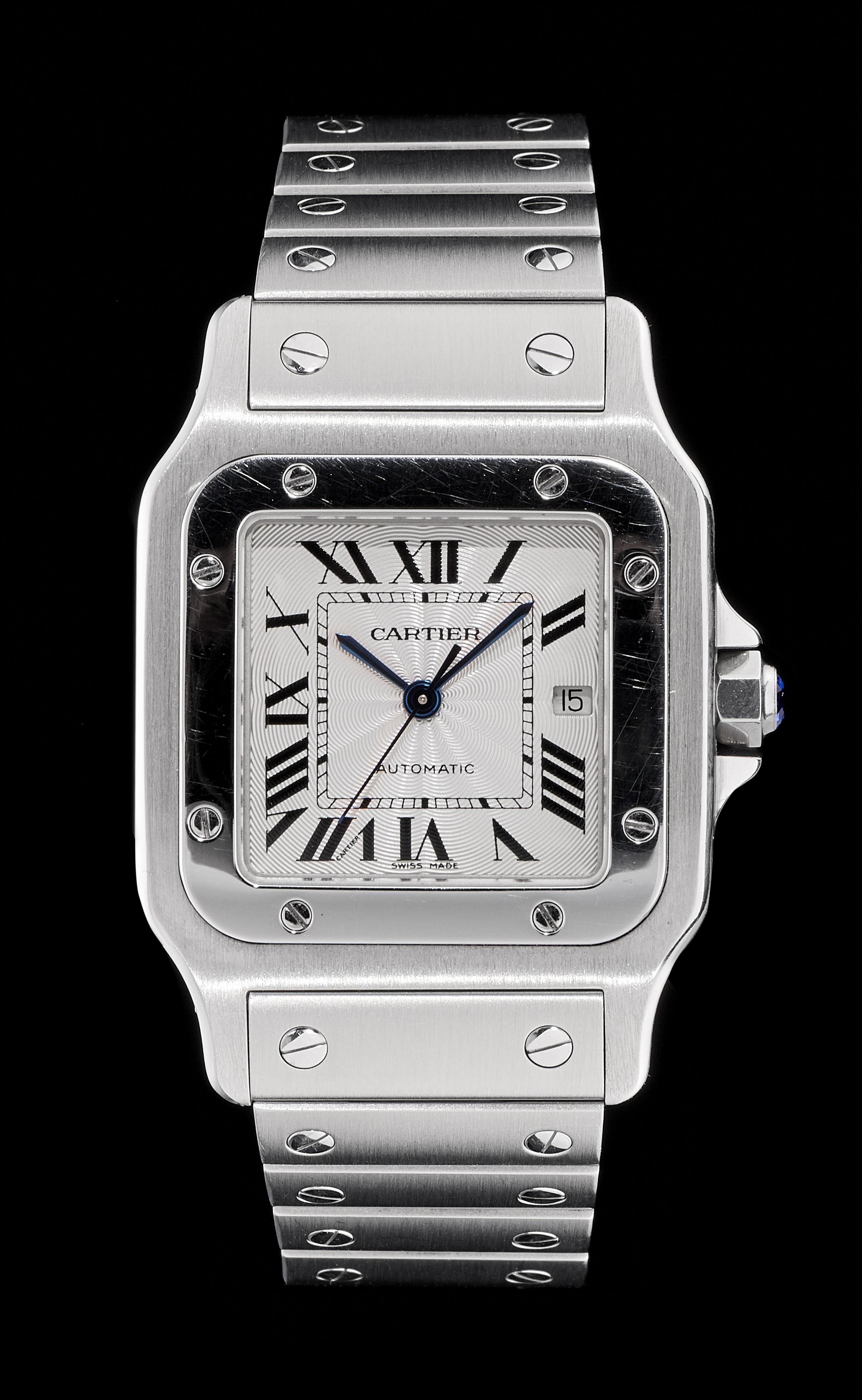 Silver dial, black Roman numerals, blue hands, date window at 3 o'clock, steel, 28x28 mm