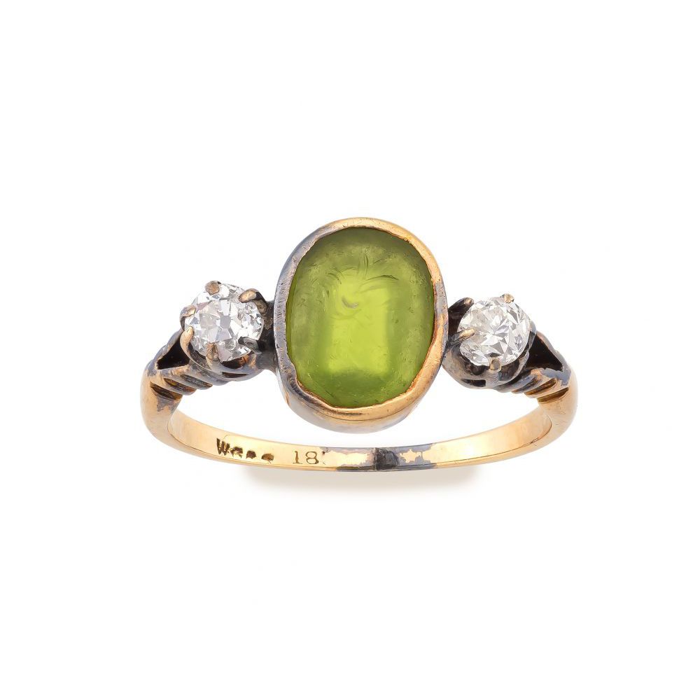 Carved green glass intaglio and diamond ring, 19th century, 19th century