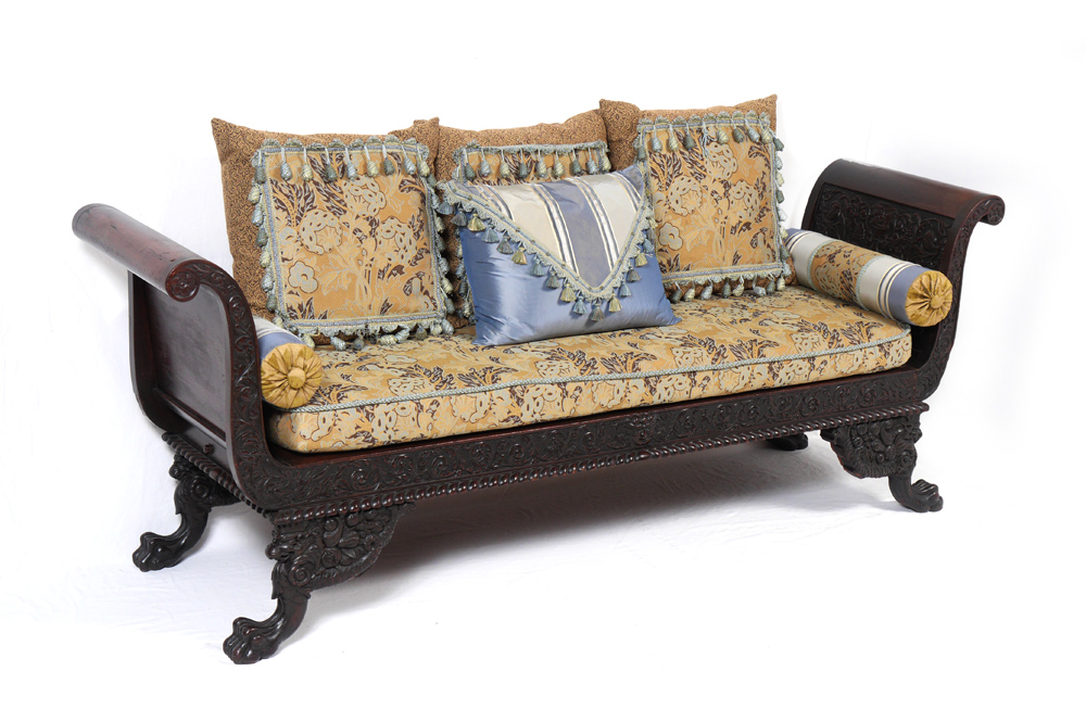 Carved all over with urn, floral and masquerons, scroll arms, paw feet. Vibrant upholstered seat and luxurious pillows. Measures 32 1/2'' h. x 87 1/4'' x 25''.