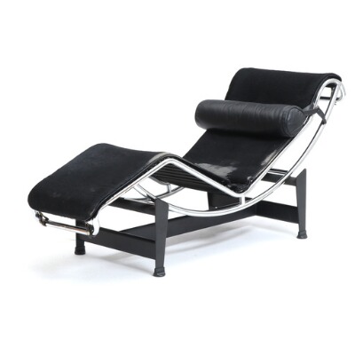 Chaise longue with black lacquered steel frame, loose cushion in seat and back with pony hide