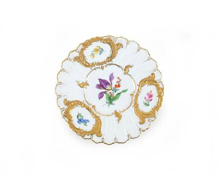 Flowers and burnished gold. Blue swords Meissen, 20th century. Ø 23 cm