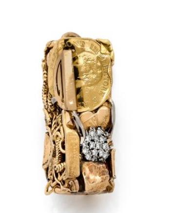 In 18k yellow gold (750), studded with brilliant-cut diamonds and old, held a black leather cord, the bail retractable Towards 1973-1974 Signed Caesar High. 5.2 cm, Gross Weight: 135.45 g