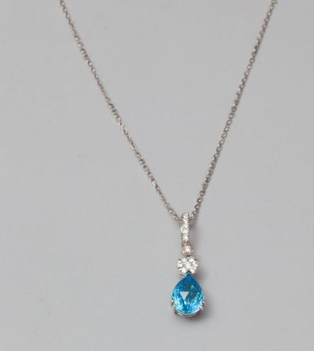 Chain and pendant in white gold, 750 MM, decorated with a blue pear