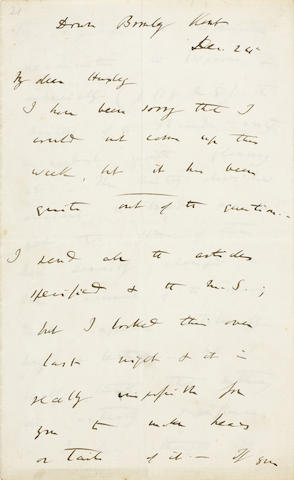 Autograph Letter Signed ("C. Darwin"), 2½ pp, 8vo (conjoined leaves), Down [House], Bromley Kent, December 24, n.y. [1859], to Thomas Henry Huxley, mild toning to edges, fine condition. Provenance: Sotheby's, Dec 17, 1979, lot 76.