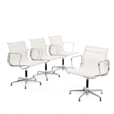 A set of four swivel chairs of chromed aluminium. Seat and back of white mesh. (4)