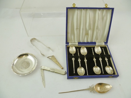CHARLES S. GREEN & CO. LTD. A CASED SET OF SILVER COFFEE SPOONS IN THE FORM OF ANOINTING SPOONS, produced in Queen Elizabeth II Coronation year, Birmingham 1952, together with a white metal EASTERN SPOON, a pair of SUGAR NIPS, silver bladed foldingmo