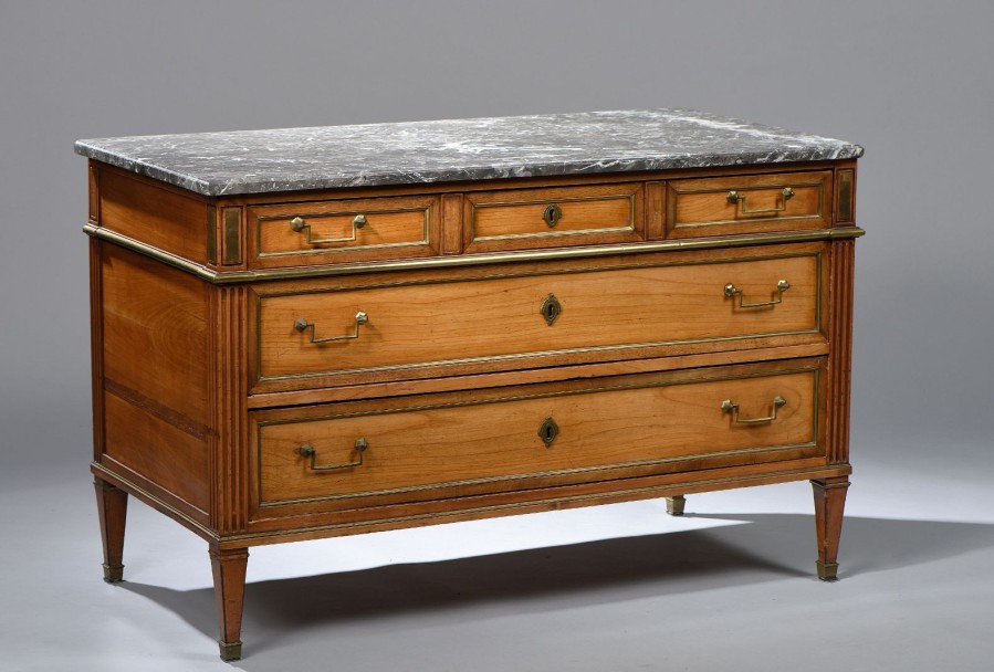 Straight chest of drawers in cherry wood and walnut frame opening to three drawers, the top one to three reserves. Pillars in fluted pilasters finished with cladding feet. Brass ornamentation: drop handles, chopsticks, locks and hoofs (two slits, mis