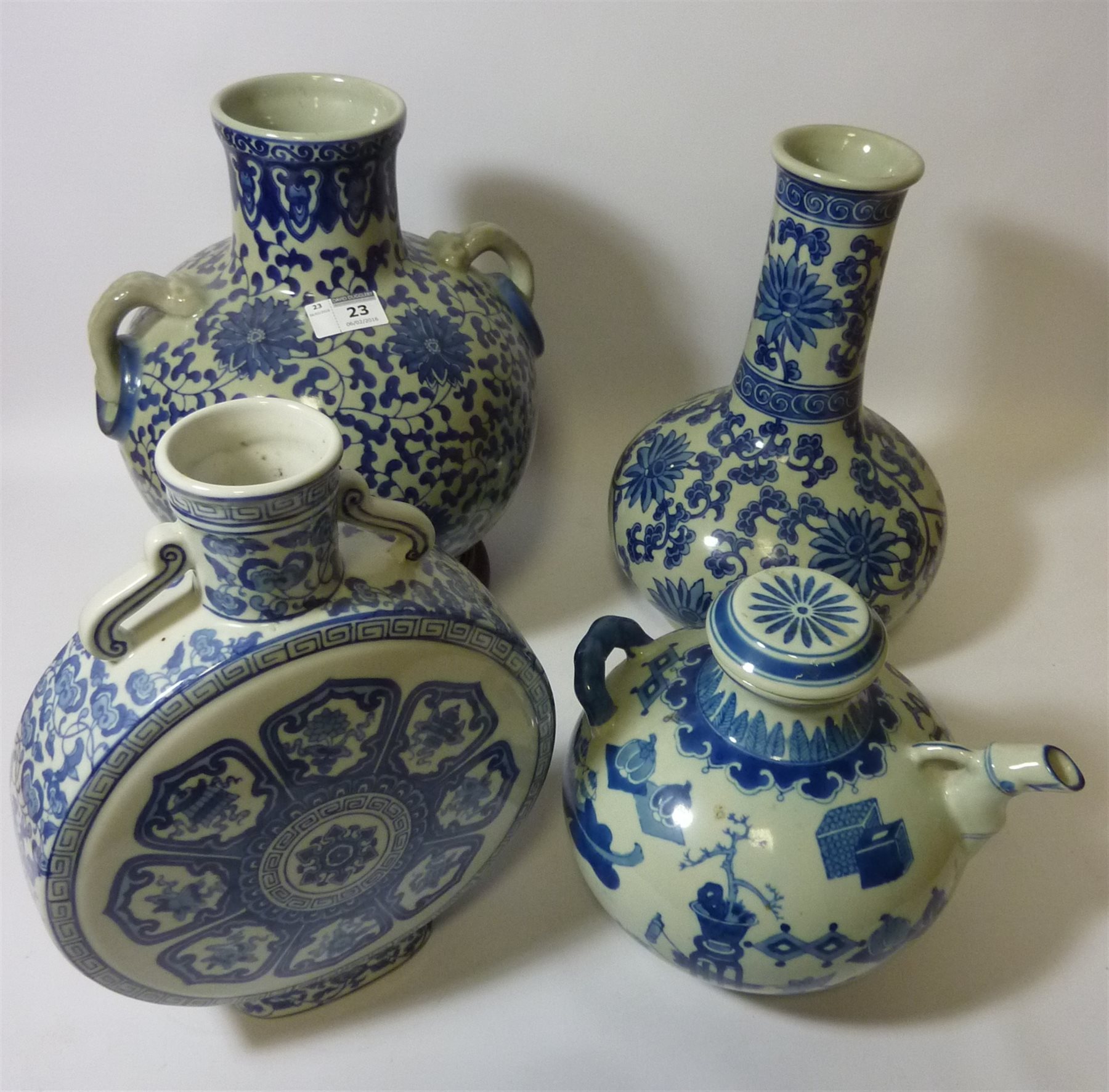 Chinese blue and white twin handled baluster vase, a similar vase, moon flask and teapot