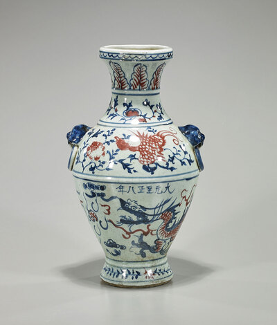 Chinese Ming-style blue and red porcelain vase; of ovoid form, with moulded animal mask handles pending faux rings; showing writhing dragon chasing flaming pearl to lower section of body, and phoenix in flight amid scrolling flora to top; six-charact