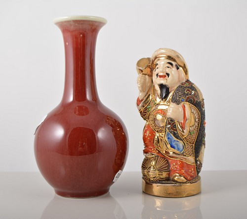 sang de boeuf glaze, six character seal mark, 16cm high together with a Chinese stoneware teapot, incised landscape decoration, blue and white bottle vase, a lacquered wooden vase with fish design, a pottery figure of a Monk and a carved wooden figur