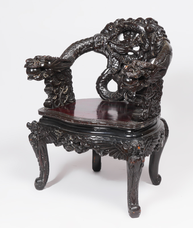 Carved all over, back with openwork dragon motif, shaped arms ending in dragon's head handholds. Shaped seat and skirt with winged masquerons at front knees, carved and shaped legs