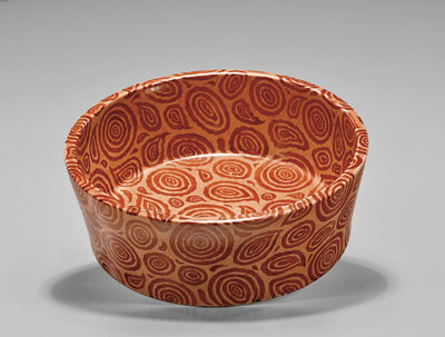 Rare and large Chinese porcelain basin; of wide circular form, with fine coral-red glaze in faux bois patterning imitating wood grain; 18th/19th Century; D: 13 1/2"