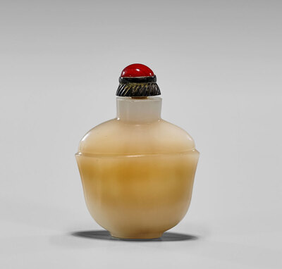 Chinese glass snuff bottle; of milky white and tan coloration, reminiscent of agate; the body of compressed "bowl"-shape with sharply ridged shoulder; 18th-19th Century; H: 2 1/4" (approx.); metal-mounted glass stopper