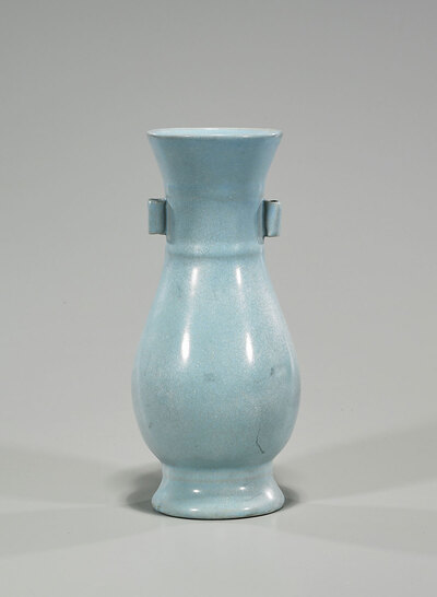 Chinese porcelain vase; of ovoid form, with flared rim, stepped base, and moulded handles; showing a monochrome blue glaze throughout; H: 9" (approx.)
