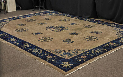 Chinese wool rug; centering birds amid flora and rockery, bordered by floral and meander motifs on a tan ground; bordered by flowers on a blue ground; 139" x 106" (approx.)