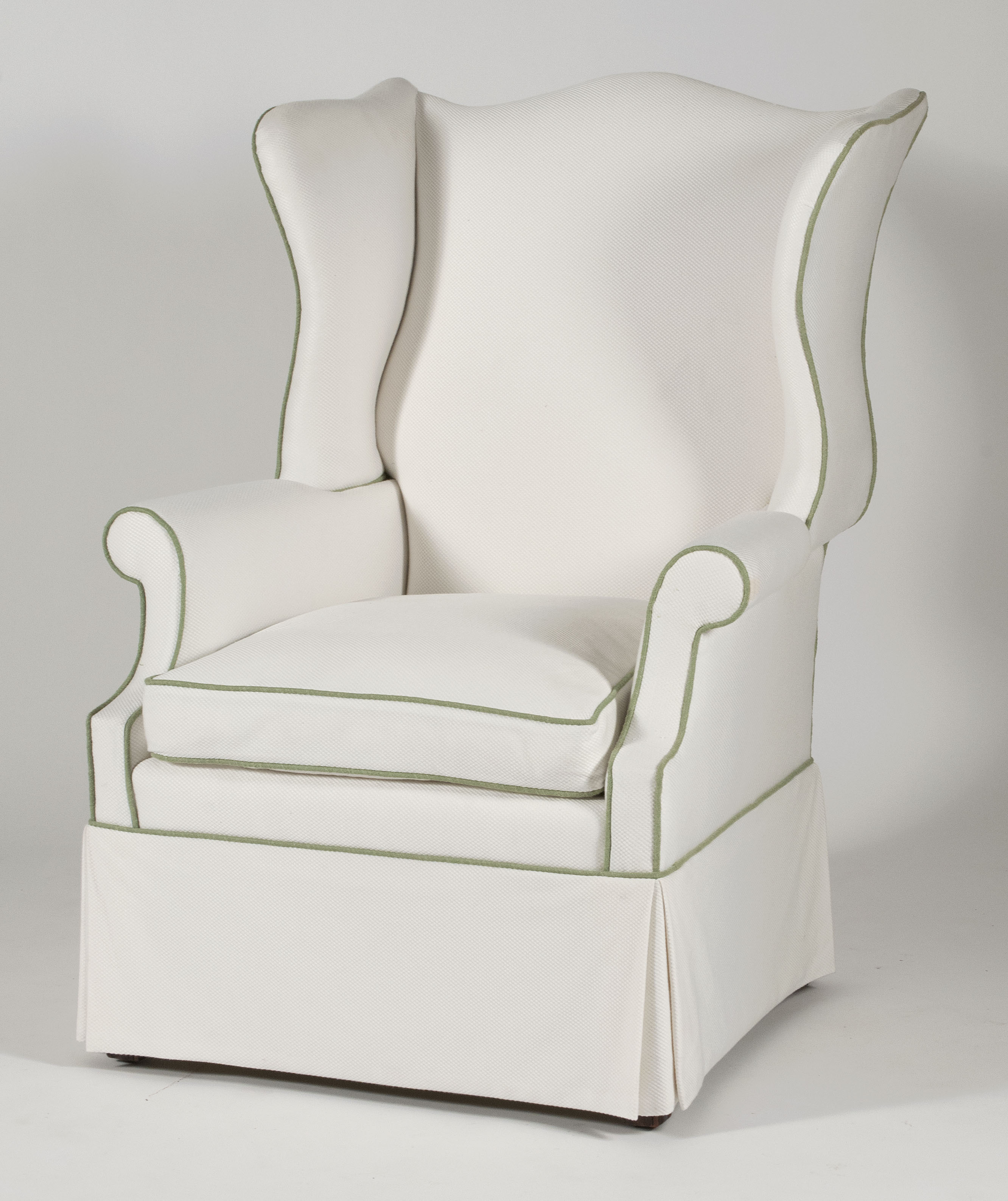 With block molded front legs and H-stretcher base. Off-white upholstery with green piping. Overall height 42. Seat height 18.5"."