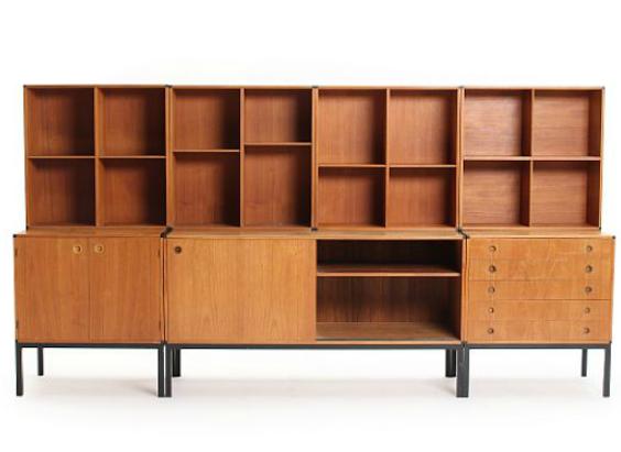 A teak wallunit comprising sideboard, cabinet, drawer and four bookcases