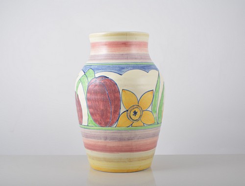 ribbed swollen form, decorated with a band of stylised flowers in pastel cones, Bizarre back stamp