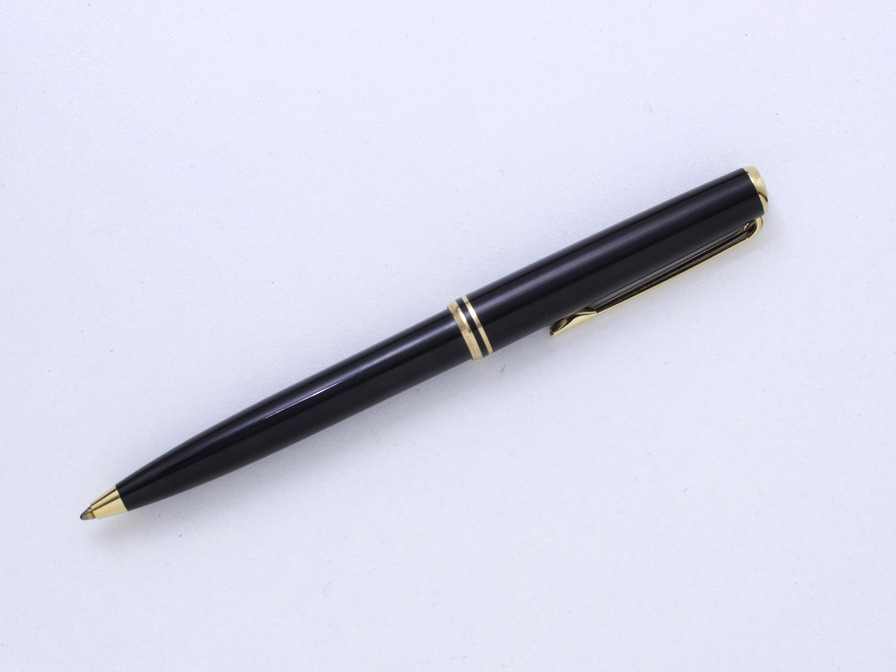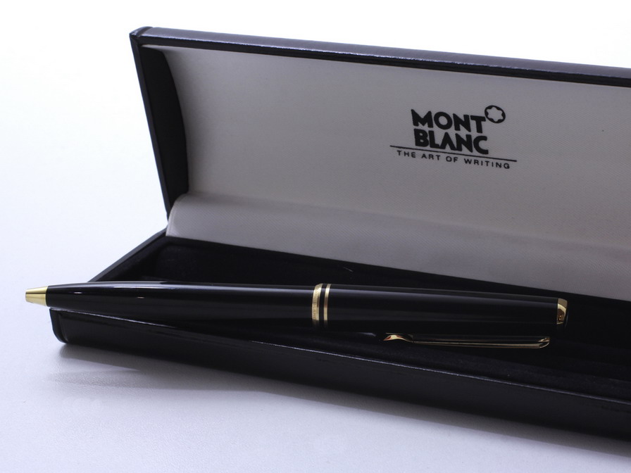 Stylo à bille en métal doré et résine noire, emblème Montblanc incrusté. Signé. Il est accompagné de sa boîte contenant son écrin et ses papiers.