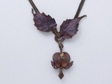 Claude LALANNE Collier composé de 2 chaînes colonnes en métal, décoré de 2 feuilles de rosier en cuivre à patine brune faisant fermoir et retenant une fleur ''cœur de Marie''. Non signé. Long: 41 cm. Claude Lalanne transforme des éléments naturels te