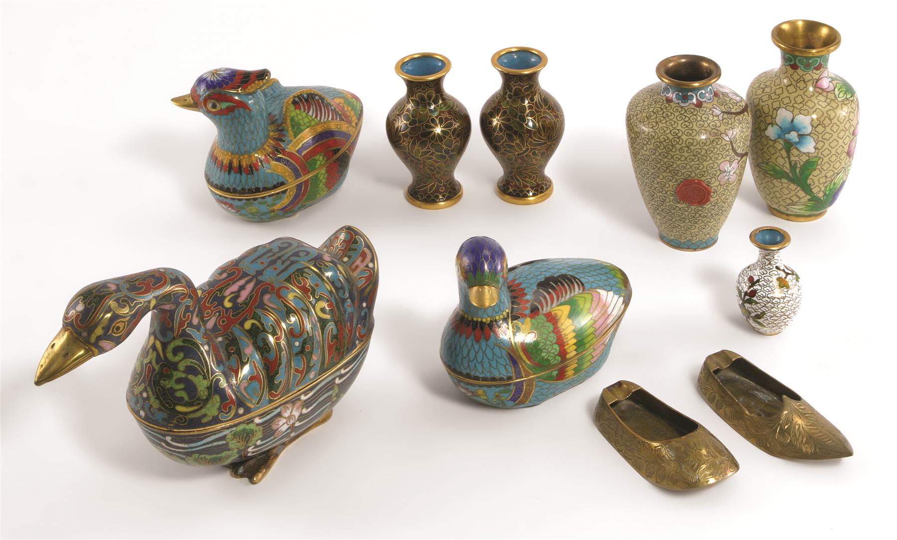Three lidded vessels in the form of swimming ducks, five diminutive vases, and pair of brass Indian shoe ashtrays