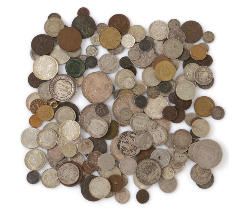 Collection of coins from Denmark, England, Iceland, Norway, Portugal, Russia, Sweden, Germany, USA and Austria, etc., in totla m