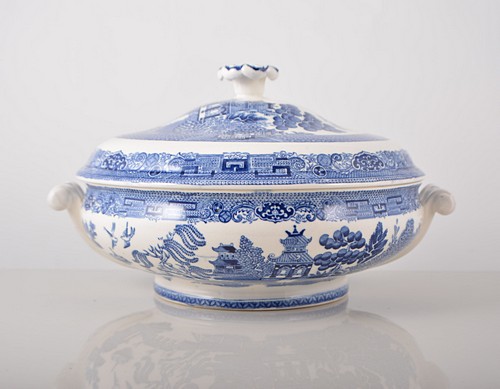 and white ''Willow'' pattern dinner wares, also other Victorian ''Willow'' pattern meat plates and pottery, (2 boxes).