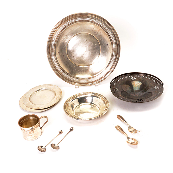 Comprising a Redlich tray {diameter 11 3/8 inches}, basket with handle, Reed & Barton bowl, Waterford child's cup with fork and spoon, pair of Wallace bread plates, and a pair of Japanese demitasse spoons (10) {Total silver weight 34.4 troy oz}