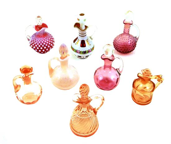salmon, and mauve, eight pieces: pink cut to clear bottle with white hobnails, 6 5/8" h.; two bubble gum pink bottles, first hobnailed and second dimpled, both with multifaceted clear stoppers; cased glass bottle with hand-painted floral decoration,
